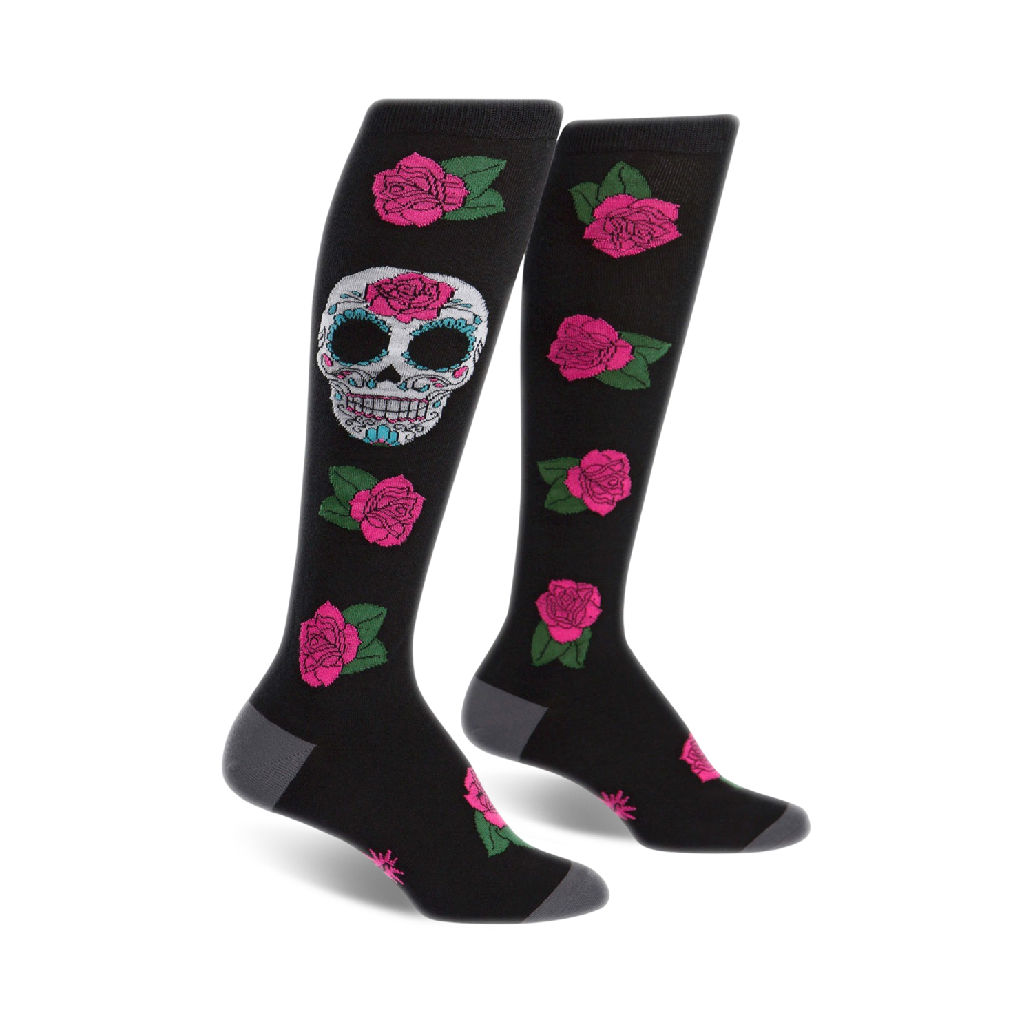 Feast your eyes on these knee-high Sugar Skulls socks! The bright pink roses and sugar skulls will add a dose of fun and flair to any outfit. The black background ensures these socks will stand out, and the comfortable fit and quality construction make them great for any occasion. Plus, you'll love the unique design of the sugar skulls - they're a little spooky and a whole lot of fun!